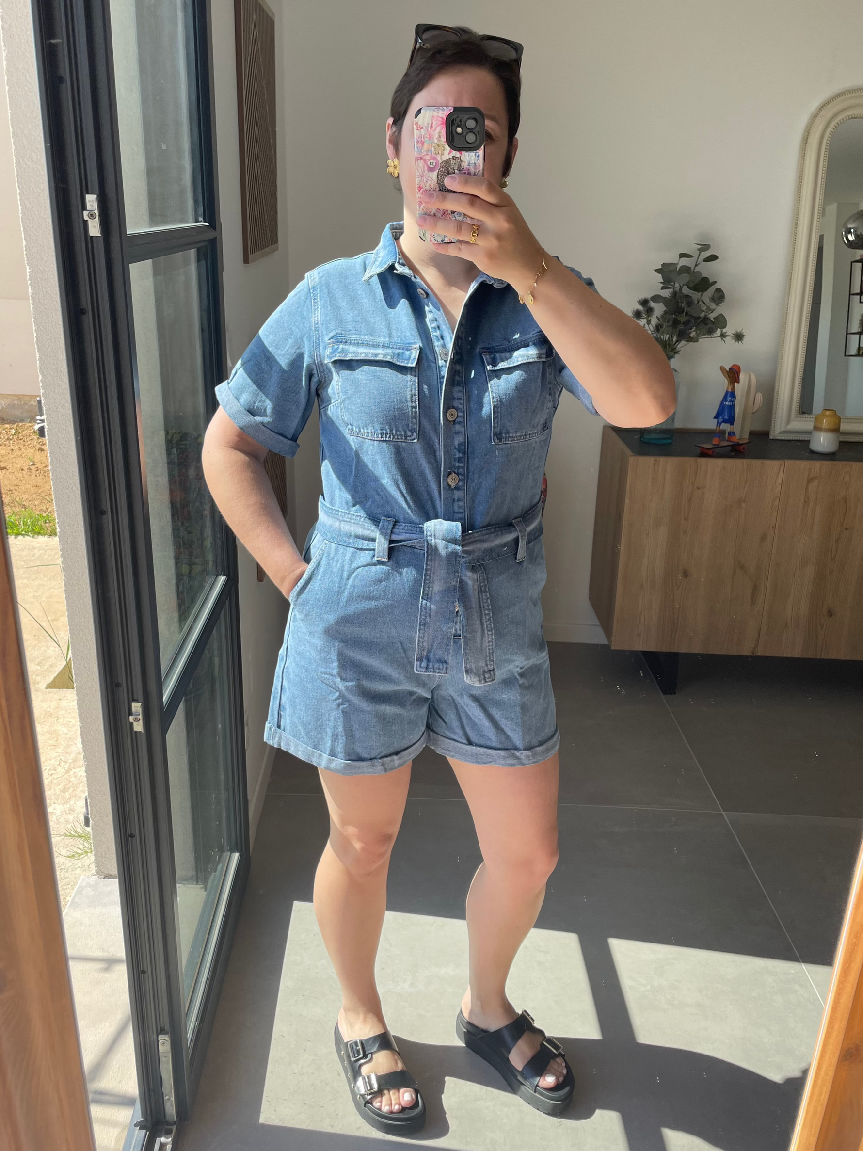 - Combishort en jean manche courte et ceinturé