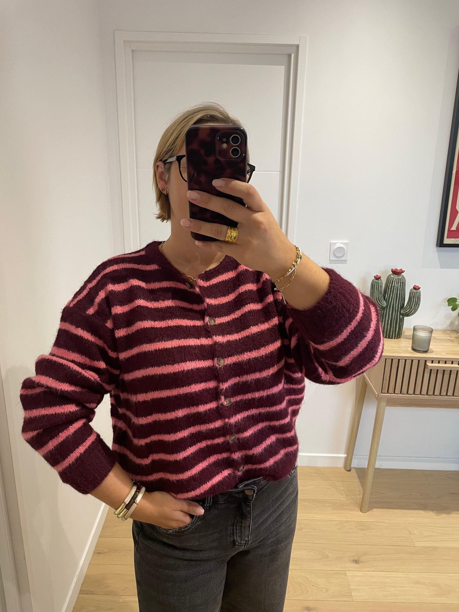 • cardigan bordeaux rayures rose